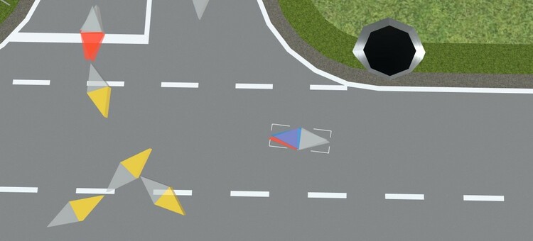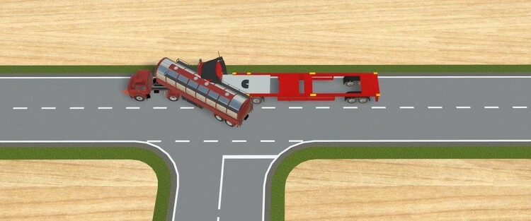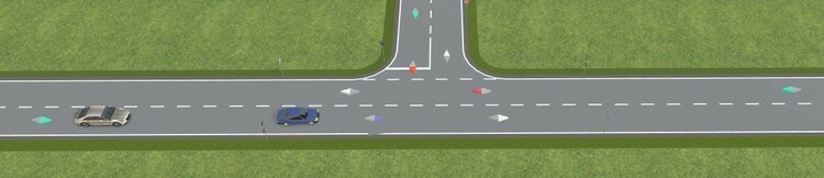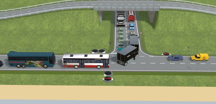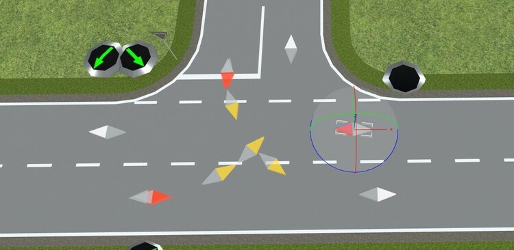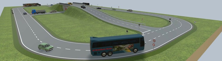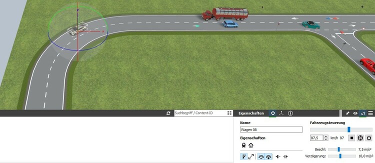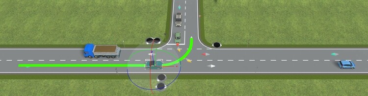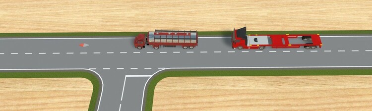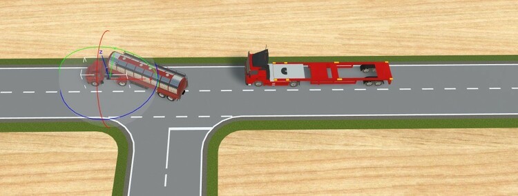 Hallo Zusammen, ein weiterer Punkt, der noch geklärt werden muss, ist das Verhalten von Anhängern / Sattelzügen auf Kreuzungen/Abzweigen an den Stellen, wo zwei Fahrspuren aufeinandertreffen. Hier mal eine typische Situation an einem Abzweig. Am Ende des Abzweiges habe ich eine Gleiskontakt (Geschwindigkeit = 0) kurz hinter der Stelle platziert, an der die beiden Spuren "Geradeaus" von rechts und "Linksabbieger" der Abbiegespur von unten zusammentreffen. An beiden Fahrzeugen ist die automatische Verzögerung und automatische Beschleunigung eingeschaltet. Hält der vordere Sattelzug auf der normalen Strecke an, bleibt der zweite Sattelzug hinter dem ersten Sattelzug auch mit einem Abstand zum Auflieger stehen. In einer Kreuzung verhält sich das aber anders. Die Zugmaschine des ersten Sattelaufliegers hält planmäßig an dem roten GK, aber der Sattelauflieger schlägt auf die Abbiegespur aus. Dadurch erkennt das folgende Fahrzeug den Sattelauflieger nicht mehr und fährt bis auf die Zugmaschine auf. Interessant ist, wenn man den Stop-GK so ausrichtet , das er kurz hinter der Schnittstelle der Fahrspuren liegt, erkennt man, das auch die Zugmaschine auf die Abbiegespur springt. Es betrifft also nicht nur Fahrzeuge mit Anhängern oder Sattelzüge, sondern alle Fahrzeuge! Es ist im normalen Betrieb nur nicht explizit wahrnehmbar. Man merkt es aber deutlich, wenn die Fahrzeuge mit einer Geschwindigkeit <5 km/h über diese Schnittstelle fahren. Viele Grüße, Hawkeye