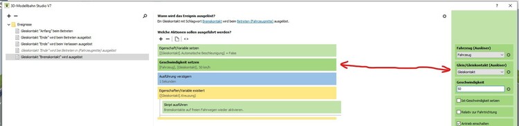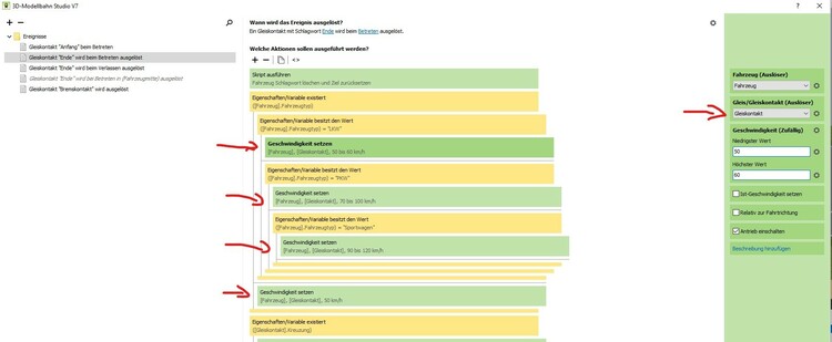 Moin, einen kleinen Fehler habe ich schon entdeckt. Bei den Einträgen "Geschwindigkeit setzen" für die Fahrzeuge muss natürlich als Auslöser der "Gleiskontakt" stehen und nicht [Alle Gleise/Gleiskontakte]. Das ist insgesamt 5x zu ändern. Sorry, war schon sehr spät. VG, Hawkeye