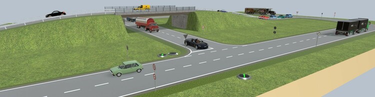 Hallo Zusammen, hier eine weitere Überarbeitung mit einem Versuch eines kleinen Sicherungssystem. Kreuzt ein Fahrzeug die Hauptstraßen, dann werden die Hauptfahrtrichtungen (FaRi: Ost West und West-Ost) solange auf Stop mit V=0 gesetzt, wie sich ein Fahrzeug auf den Kreuzung (im Bereich der Hauptspuren) befindet. Bei einem Stau bis in die Kreuzung sollten dadurch Kollisionen verhindert werden. (sollten! ) Ein paar Probleme bleiben dennoch übrig und werden sich wohl auch so schnell nicht beseitigen lassen. Durch die Dynamik des Straßenverkehrs kann einem Fahrzeug auch mal sehr spät die Anweisung "Abbremsen auf "0" zugewiesen werden. Dadurch kann es dazu kommen, das der Verzögerungsweg nicht mehr ausreicht, um noch rechtzeitig am Gleiskontakt zum Stehen zu kommen. Dann bleibt es halt stehen und reagiert nicht mehr auf die Anweisung zur Weiterfahrt am Gleiskontakt. Bei Abbiegespuren kann es auch den Effekt haben, das ein nachfolgendes Fahrzeug durch ein stehendes abbiegendes Fahrzeug hindurchfährt. Abzweig mit Vorfahrt achten 03 mit Sicherungsstop.mbp Weitere Verbesserungsvorschläge sind gerne willkommen. Viele Grüße, Hawkeye
