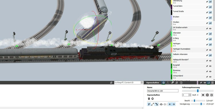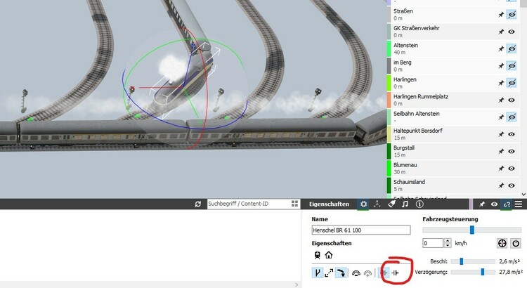 Hallo @Andy, Ich kann dir zwar nicht sagen , woran es genau liegt, aber es hat etwas mit deinem 2. Punkt, der automatischen Beschleunigung eines Fahrzeuges zu tun. Die Henschel wird in der aktuellen Warteposition auf ca. 3 km/h beschleunigt. Wenn du sie etwas weiter weg setzt, verringert sich der Wert. Die automatischen Beschleunigung reagiert aber nur dann, wenn die Kupplung "vorne" auch aktiv ist. Wen du diese Kupplung deaktivierst, reagiert die Henschel nicht mehr auf den vorbeifahrenden Zug. Viele Grüße, Hawkeye