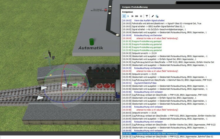 Hallo Zusammen, zur Darstellung des Fortschritts mit der automatischen GBS-Anzeige, habe ich die Testanlage etwas modifiziert, um auch komplexere Fahrstraßen berücksichtigen zu können. Der Ablauf ist vollautomatisch. Per Schalter kann der Ablauf durch den Zug auf Gleis 5 (Siemens Vectron) gestört, bzw. zu einem beliebigen Zeitpunkt beeinflusst werden. Hinzugekommen ist die Anzeige von "gesperrten Weichen" bei blockierten Fahrstraßen. Die hier rot leuchtenden Lämpchen auf den Weichen zeigen nicht die "gesperrten" Weichen der aktiven Fahrstraße "blau" an, sondern für die "blockierte" orange Fahrstraße des VT641 , der noch warten muss. Weiterhin werden im Sekundentakt die Zustände und der jeweilige Status der Fahrstraßen im Ereignisprotokoll angezeigt. Ebenso werden in den Fahrstraßen per Liste die z.Z. gesperrten Weichen festgehalten, was zur Fehlersuche ganz nützlich ist. Im Großen und Ganzen funktioniert das Experiment ordentlich. Die Kunst liegt darin, die Fahrstraßen so einzurichten, das ein flüssiger Ablauf entsteht und eine Fahrstraße die gerade verlassen wird, nicht zu früh wieder aktiviert wird. Viele Grüße, Hawkeye Demo-GBS Spuren per EV schalten -V 02.mbp