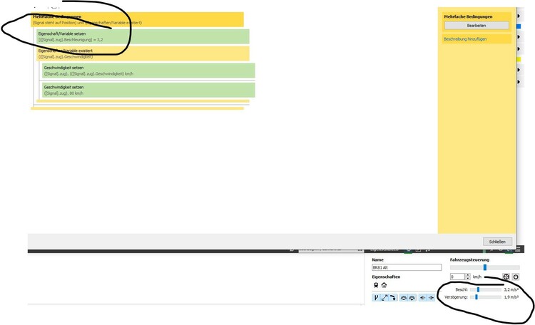 Hallo Markus, der Anfang ist gemacht. Sieht doch gut aus. Beschleunigungs- und Verzögerungswerte brauchst du aber normalerweise nicht dauerhaft über die EV einstellen, da sie für jede Lok individuell eingestellt werden können und keine Einfluss auf die Zielgeschwindigkeit haben. (Diese wird nur je nach Einstellung früher oder später erreicht.) Es sei denn, die Werte sollen im Streckverlauf verändert werden, was aber nur selten Sinn macht. Zum Ausprobieren, ob es funktioniert, ist es auf jeden Fall sinnvoll. Weiter so. .... Viele Grüße, Hawkeye