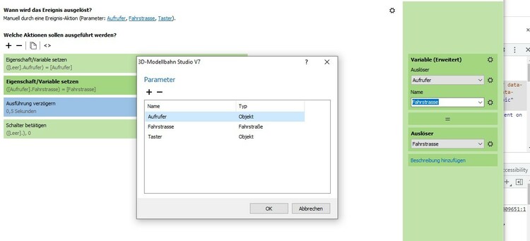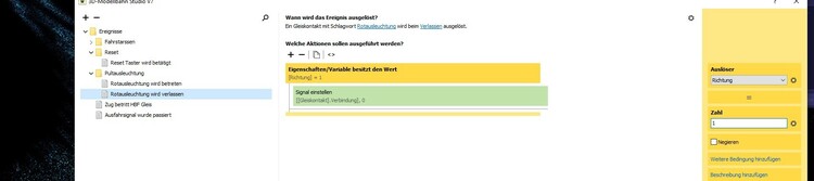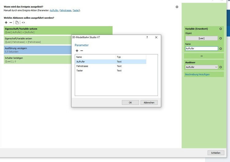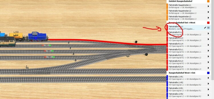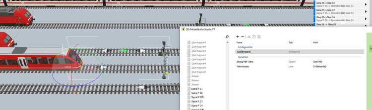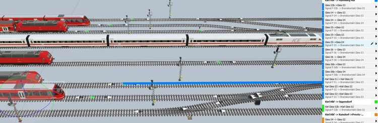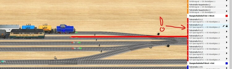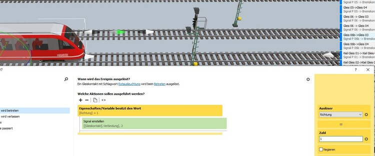 Hallo @Markus40, da sind bei Dir doch einige dicke Brocken in der EV, die auf grundlegende Dinge zurückzuführen sind. 1. Ein normaler Gleiskontakt ist kein Signal, das geschalten werden kann. Er löst beim Betreten, in Fahrzeug(Mitte) oder beim Verlassen des Kontaktes aus. Was ist Rotausleuchtung? Das sagt mir nichts. Was soll dadurch ausgelöst werden? Was bezweckst du mit der "Gleiskontakt.Verbindung" als Signaleinstellung? Ein GK ist kein Signal aber ein Signal hat einen GK. Ein Zug kann bei Aktivierung einer Fahrstraße nur dann losfahren, wenn das Signal auch weiß, das eine Lok da ist. Das geht über 2 Wege, einmal, wenn der Zug auf den GK des Signals steht oder der Zug im Signal als Variable gespeichert ist. (Ist hier beides nicht der Fall.) Er steht nicht auf dem GK des Signals: und das Signal zum Zug hat keine Variable in der Zug gespeichert ist. Mein Tip, für Dich. Mache dich zuerst einmal, auf auf einer kleinen Anlage mit den Prinzipien der EV und der Fahrstraßensteuerung vertraut. Es sind viele Verständnisfehler in deiner Steuerung vorhanden. Danach wirst Du auch selbst erkennen können, wo die Fehler versteckt sind. Viele Grüße, Hawkeye