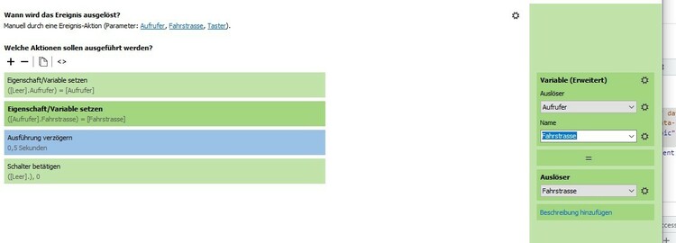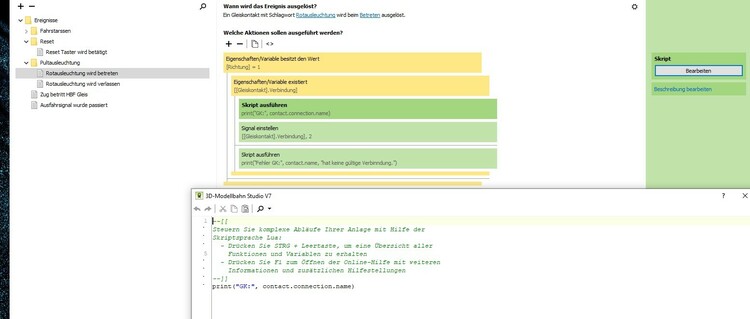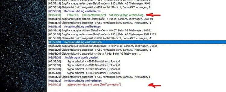 Hallo @Markus40, hier ein Tip zur Fehlersuche. Wenn das MBS im Ereignisprotokoll einen Fehler meldet, kannst du ihn z.B. dadurch eingrenzen, indem du prüfst, ob die Variable, die du für das Auslösen eines Ereignisses verwenden möchtest, auch existiert. Nützlich ist hier die einfache print("Hallo") - Anweisung, mit der du dir den Text = Hallo ins Ereignisprotokoll schreiben kannst. Beispiel in deiner Anlage: In dem solchen Ereignis Die neuen Zeilen analog ergänzen Dann steht im Ereignisprotokoll das folgende: Das ist gerade am Anfang nützlich. Wenn es dann funktioniert, können diese Einträge wieder gelöscht werden. Viele Grüße, Hawkeye
