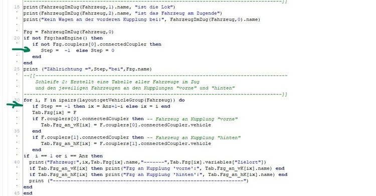 Hallo Wolfgang, danke. Das hoffe ich doch. Ich habe selbst dabei wieder viel gelernt. Wie ich dabei festgestellt habe, ist das nicht der Fall. Es gibt 4 verschiedene Möglichkeiten der Kombination der Ausrichtung vom ersten und letzten Fahrzeug. Bei 1. - 3. stimmt die Zählreihenfolge bei ipairs() beginnend mit der Lok = 1. Nur bei 4. beginnt die Reihenfolge jedoch mit dem letzten Wagen bei = 1 Deshalb muss bei 4. die Reihenfolge der Fahrzeuge in der Tabelle beim Einlesen umgekehrt werden. Es gibt vielleicht noch eine elegantere Lösung dafür, mir ist bisher nur nichts Besseres eingefallen. Viele Grüße, Hawkeye