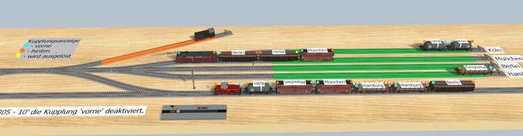 Hallo @prinz, ich habe mit deiner Idee der Kupplungserkennung auch mal ein wenig experimentiert und sie in einer kleinen Rangieranlage umgesetzt. Mit dem Hinweis von Götz lässt sich schon eine Menge anfangen. Die folgenden Dinge habe ich mal umgesetzt. Damit man auch im laufenden Betrieb sehen kann, was passiert, habe ich die vordere und hintere Kupplung durch Andy's Leuchtwürfel mal sichtbar gemacht und die Fahrziele auf den Wagen platziert. (Dadurch kann man die Ausrichtung im Zug sehr gut erkennen.) Es sind 3 Züge vorhanden. Die erste (BR 218-2) rangiert ohne Anzeige (zur Verifizierung der Steuerung). Die beiden anderen Loks mit den Wagen sind mit Anzeige. Die Ausrichtung der Wagen und der Loks kann beliebig verändert werden, sie hat keinen Einfluss auf den Rangierbetrieb. Sind mehrere Wagen mit dem gleichen Zielort hintereinander im Zug, werden alle Wagen mit dem gleichen Zielort zusammen abgekuppelt. Viele Grüße, Hawkeye Demo-Rangieren mit automatische Kupplungserkennung.mbp