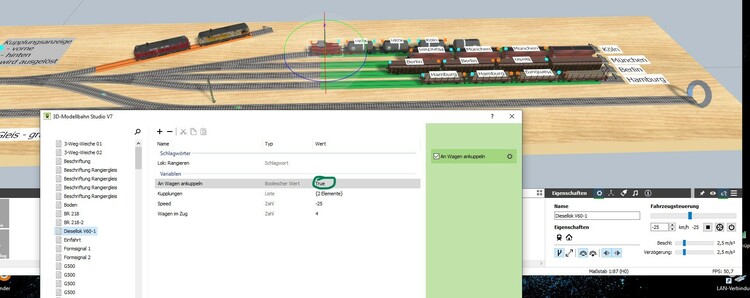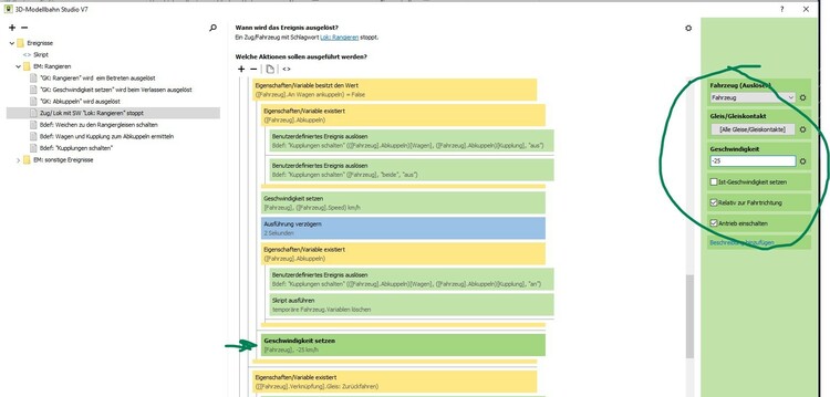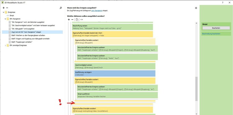 Hallo, ich habe in der obigen Anlage gerade festgestellt, das eine kleine Anweisung fehlt, um die Waggons nach dem Sortieren auch wieder herausfahren zu können! Hier zur Korrektur und zum Einfügen der erforderliche kleine Eintrag: Dann klappt es mit der Einstellung "An Wagen ankuppeln" = True auch mit dem rausfahren. Viele Grüße, Hawkeye
