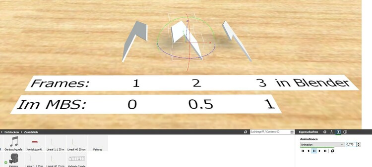 Hallo @Neo, Ich hab mal mit verschiedenen Anzahlen von definierten Frames in Blender experimentiert, um die Abspielgeschwindigkeit zu beeinflussen. Dabei habe ich etwas Interessantes festgestellt. Die folgende Animation hat nur 3 Frames in Blender: Die Zwischenschritte zwischen 0 und 1 werden mindestens in 1/1000 im MBS erzeugt. Müsste es dann im MBS nicht auch möglich sein, die Abspielgeschwindigkeit zu variieren? So in die Richtung Zeitlupe und Zeitraffer ? Nur mal so als Gedankenspielerei. Viele Grüße Hawkeye