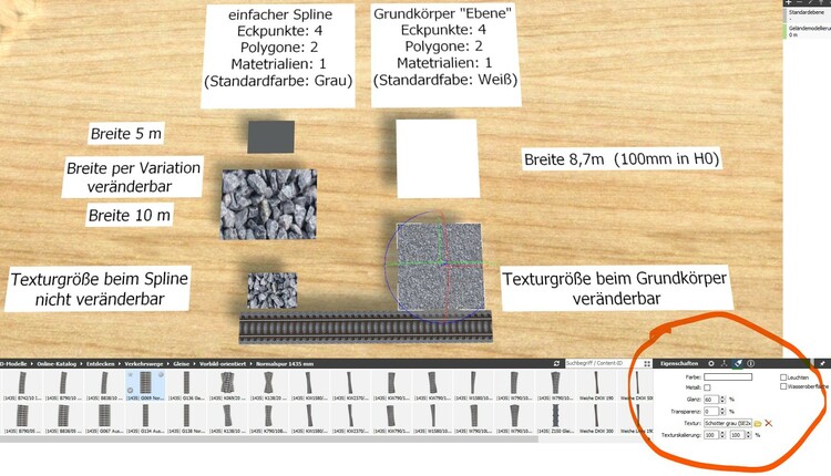 Hallo Andy, Habe ich noch nicht verwendet, werde mal auf die Suche gehen. Den Spline habe ich in den Breiten 10m und 20m nur als Hilfsmittel für die Geländemodellierung verwendet und nach der Höhenanpassung wieder gelöscht. Eine Textur lässt sich dann wieder mit den bekannten Einstellmöglichkeiten auf das Gelände auftragen. Der Spline ist nur eine einfache Fläche mit Tauschtextur und in den verschiedenen .glb-Dateien entsprechend der angegebenen Größe skaliert. (.varlist siehe oben) VG Hawkeye