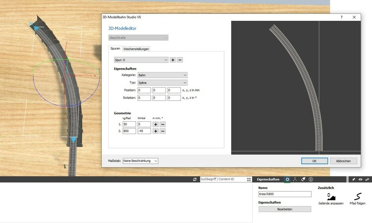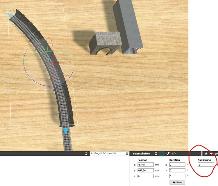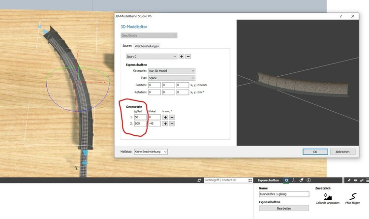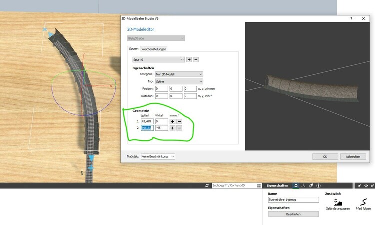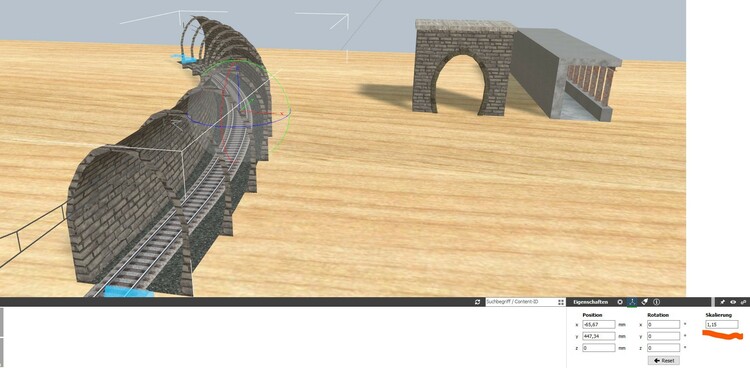 Hallo @Neo, da du ja bereits mit der Planung der MBS Version 7 begonnen hast, hätte ich hierfür auch 2 Vorschläge zu den Themen: 1. Skalierung beim Einrasten von 3D-Objekten an Spline-Objekte beibehalten. 2. Skalierung beim "Pfad folgen", also Spline-Objekte an Spline-Objekte beibehalten. (folgt noch) Beispiel zu 1: Tunnelportal an Gleis anfügen - Ausgangssituation Wenn man einen Tunnel über ein Gleis mit Oberleitung legen möchte, muss man den Tunnel und das Portal skalieren, damit die Oberleitung bzw. die Abhängung in den Tunnel hineinpassen. Hier mal Faktor 1,15 Schiebt man jetzt das Portal zum Gleis rastet das Portal am Gleis ein und lässt sich auch im Bogen entlang des Gleises verschieben. Aber die vorher eingestellte Skalierung der Faktor 1,15 wird automatisch wieder gelöscht! Beheben kann man das zwar , wenn man das "automatische Einrasten" ausschaltet. Dann wird die Skalierung beibehalten, aber das Portal muss dann von Hand in die richtige x, y - Position und Rotation (z-Achse) verschoben/rotiert werden. Das ist je nach Situation ein schöne filigrane und mühevolle Detailanpassung. Da das Programm ja "erkennt", das die beiden Objekte, die zueinander Einrasten sollen, unterschiedliche Skalierungen haben und diese bisher automatisch ändert, wäre mein Vorschlag hierzu eine Abfrage im Programm einzufügen, wie bei dem folgenden Beispiel der Geländehöhenanpassung. z.B., Ein Fenster mit: "Die Objekte haben verschiedene Skalierungen, Skalierung beibehalten?" -> Auswahlfelder [ja] [nein] (Beispiel zu 2. folgt noch) Viele Grüße Hawkeye