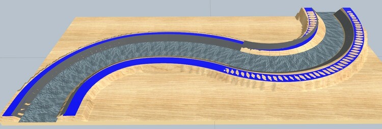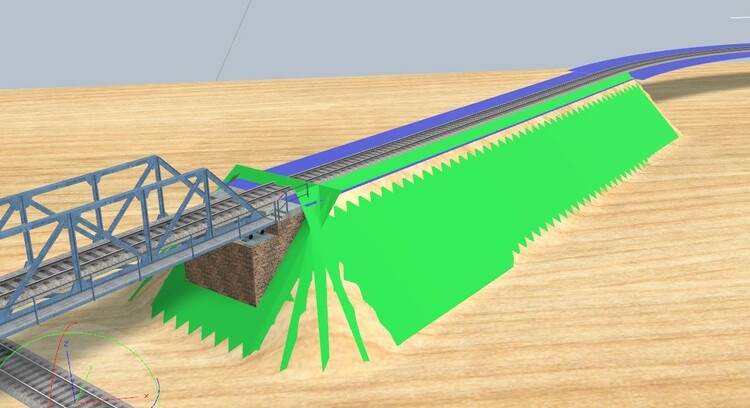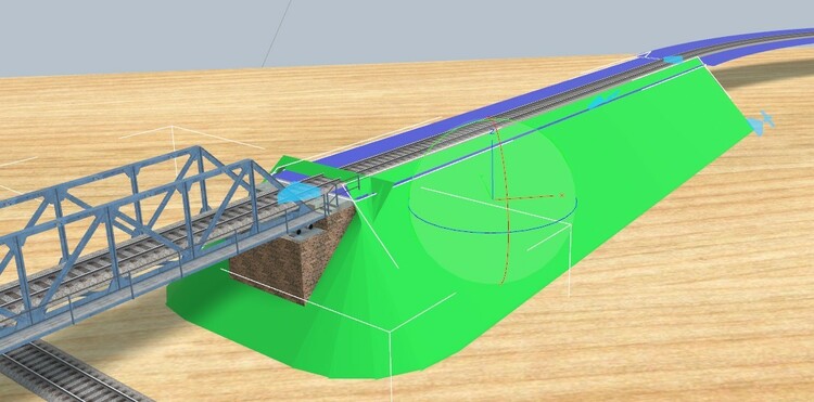 Hallo Andy, ist es wohl nicht. Habe es unter "Landschaftsgestaltung gefunden. Sieht toll aus mit der animierten Wasseroberfläche und der Transparenz. Darf nur nicht auf "pausiert" stehen, sonst sieht man die animierte Wasserfläche nicht. Habe den Spline nochmal überarbeitet und für eine erste Testversion vorbereitet. Hier mal ein Beispiel für einen Bahndamm einer Brücke. Erstmal die Acht mit Brücke Die Gleise angehoben und und die Fläche für den Damm (8m Breite) mit "Pfad folgen" unter (mittig) die Schienen gelegt. Für die Modellierung des Damms eine eigene Ebene erzeugt, um die Gleise und die Platte oder die Modellierungs-Splines ein und ausblenden zu können. Dammabschlüsse mit Fase 45° konstruieren (jeweils ein Spline Varianten Rot oder Grün) Die grünen Seitenflächen des Damms mit Pfad folgen (gewünschten Abstand zur Mitte einstellen, ggf. berechnen) Dann NICHT MEHR in x,y-Richtung VERSCHIEBEN, sondern nur -> Neigung y-Rotation 45° bzw. -45° einstellen und nur die z-Achse an die gewünschte Position nach unten verschieben. Beispiele für Dammabschlüsse: Vor der Brücke platzieren Höhe anpassen (Die Breiteneinstellung ist etwas tricky, einfach mit ein paar unterschiedlichen Werten probieren.) Ebene "Geländemodellierung" ausblenden, fertig. Ist ein bisschen mit rechnen (Abstand der schrägen Flächen zur Gleismitte) und probieren verbunden, aber ich hab so auch noch nicht modelliert. Der Spline hat folgende Breiten als Variation: 5m, 8m, 10m, 15m, 20m, 30m, 50m jeweils in den Farben: blau, rot, grün Tauschtextur ist auch möglich, jedoch im ersten Entwurf nicht auf die Breiten angepasst. Ich warte jetzt auf die Meldung von @Neo, das ich das Modell als Entwurf mal hochladen kann, dann können auch Alle, die daran Interesse haben, mal ausprobieren, ob das sinnvoll ist oder nicht. VG Hawkeye