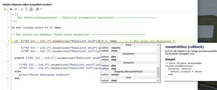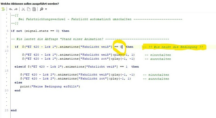 Hallo @Neo, ich würde gerne einige Animationen automatisieren, hier im Beispiel bei Loks oder Triebwagen die Scheinwerfer bei einem Richtungswechsel entsprechend der neuen Fahrtrichtung umschalten. Dazu fehlt mit die richtige Syntax für die Bedingung, die den Stand der Animation anzeigt. als Satz beschrieben, z.B.: Wenn "Fahrlicht weiß" == "aus", dann (gibt es eine solche Bedingung überhaupt?) Fahrlicht weiß -> an Fahrlicht rot -> aus 0,1,-1, true, false ergeben in dieser Abfrage kein Ergebnis Der Doppelpunkt bietet nur "play" oder "stop" Ein Punkt bietet keine Auswahlmöglichkeit für Animationen, wie etwa "state" bei Signalen oder Schaltern Kann der Stand überhaupt abgefragt werden? Oder ist es möglich, das die Abfrage in der Steuerung zu realisieren? Sonst bleibt nur der Umweg alles erstmal auf "aus" schalten und danach das gewünschte Fahrlicht wieder auf "an" zu schalten. Viele Grüße Hawkeye
