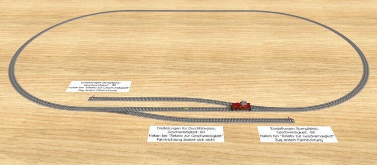 Hallo Guenter und Goetz, wenn ich darf. Die Lösung von Goetz ist die kürzeste und eleganteste. Die Auswahl "Relativ zur Fahrtrichtung" ist für Anfänger schwer zu verstehen, das damit eine Richtungsumkehr der Geschwindigkeit bei Ausfahrt entgegen der Einfahrgeschwindigkeit gemeint ist. Hier eine alternative Lösung mit einer Variablen "Fahrtrichtung", die die Einfahrrichtung erkennt, wenn es denn so für dich einfacher zu verstehen ist. Macht aber im Prinzip das Gleiche was Goetz vorgeschlagen hat. Viele Grüße Hawkeye Test - Alternative.mbp - Zugsteuerung in einer Schleife