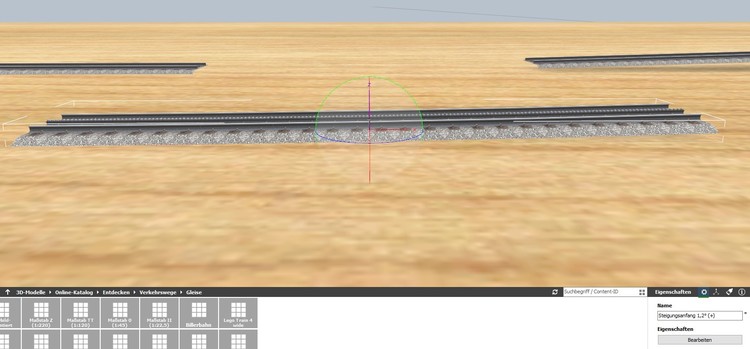 Moin, hätte da auch mal eine Frage zu dem Verlegen der Gleise. Geht man mit der Maus auf den blauen Pfeil am Gleisende, wird der Pfeil grün und per Mausklick erscheint ein Gizmo, mit dem man die Verwindung manuell einstellen kann. Unten links erscheint dann eine Winkelinformation mit 2 Winkeln, solange man mit der Maus den Kreis festhält. Wie kann man jetzt diese manuelle Verwindung wieder auf "Null" stellen? Ich schaffe das nur mit viel Geduld am gelben Kreis bis maximal 0,02°. Diese Verwindung wird aber an dem bearbeiteten Gleis in den x- bzw. y-Rotationskoordinaten nicht berücksichtigt. Beide sind "0". Mit "Reset" lässt sich diese Winkelinformation leider nicht löschen. Das Problem ist, wenn man dann an ein einmal manuell verwundenes Gleis mit dem "+"-Zeichen am Gleisende ein neues Gleis anfügen will, wird diese Information an das neue Gleis übertragen. Und erst am neuen Gleis in den x- bzw- y- Koordinaten angezeigt. Mit jedem neuen Gleis wird diese Information weiter übertragen.