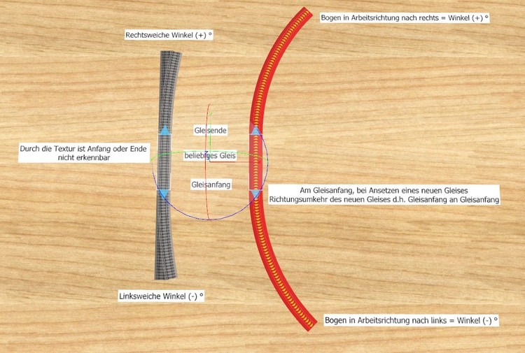Hallo Goetz, das ist ein guter Tip eines "Alten Hasen" an einen Anfänger. Habe die "unsichtbare" Ursache jetzt auch verstanden. Daher ein einfacher Lösungsvorschlag von einem Neuling, der si ch noch nicht so gut auskennt. Das Programm kennt den Gleisanfang und das Gleisende. Ich als Nutzer kann das an der vorgegebenen Gleistextur leider nicht erkennen. Daher wäre es doch am einfachsten, wenn das Programm beim Anfügen am (+)-Zeichen am Gleisanfang automatisch die Richtung des neuen Gleise ändert. Hier im Bild zur Verdeutlichung der Ist-Zustand. Beim Anfügen an beiden Enden zeigen alle Pfeile in die gleiche Richtung. Vorschlag: Wenn ich die Arbeitsrichtung betrachte ist es für mich logisch, das ein Rechtsbogen ein positives Vorzeichen hat, und ein Linksbogen ein negatives Vorzeichen. Siehe das Weichenbeispiel. Daher sollte das Programm beim Anfügen eines Gleises am Gleisanfang mit dem (+) Zeichen nur automatisch die Richtung an dem Gleis neuen Gleis ändern. Dann funktioniert es auch mit dem Gleiseditor und der Bogen geht nach links mit (-) Zeichen wie bei der Weiche. @Neo:: Ist das programmtechnisch möglich? Viele Grüße Hawkeye