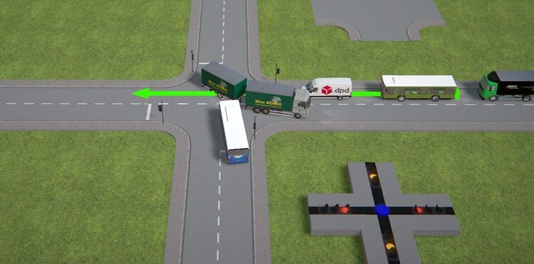 Hallo @Neo, bei Kreuzungen für den Straßenverkehr ist es häufig notwendig, Gleiskontakte, obwohl sie auf verschiedenen Spuren liegen, so zu platzieren, das Fahrzeuge sie berühren, obwohl sie gerade andere Spuren befahren. Hier mal ein Beispiel: Der Audi TT fährt mit V = 50 km/h auf die Kreuzung mit der Ampel auf "grün" zu. Auf der Gegenspur als Linksabbieger befindet sich ein langer Bus, der gerade losfährt. Deshalb reduziert der Audi TT über die EV die Geschwindigkeit auf 20 km/h, damit der lange Bus ausreichend Zeit hat die Kreuzung zu verlassen. So ist es programmiert und gewollt. Das ganze hat nur den Nebeneffekt, das auch Fahrzeuge, die nicht auf der Spur fahren, auf der sich der Gleiskontakt für die Linksabbieger befindet, dieses Ereignis auslösen. Hier könnte man es ja vielleicht noch verstehen, da der grüne LKW den Gleiskontakt fast vollständig abdeckt. Der LKW fährt aber geradeaus und biegt nicht links ab, wo sich eigentlich der Gleiskontakt befindet. Hier jedoch nicht mehr. Der LKW biegt rechts ab. Allein der Reifen des LKW auf der Spitze des Gleiskontaktes für Linksabbieger löst schon ungewünscht das Ereignis aus. Ist es möglich, das bei Gleiskontakten auch nur dann Ereignisse ausgelöst werden, wenn die Fahrzeuge tatsächlich auf der Spur fahren, auf der sich auch der Gleiskontakt befindet? Dies ist zwar nur ein Beispiel, aber dieser Effekt hat deutlichen Einfluss auf die gesamte EV-Steuerung. Dann darf man sich auch nicht wundern, wenn Fahrzeuge sich anders verhalten, als es die EV-Programmierung vorsieht. Es werden dadurch Ereignisse ausgelöst, die nicht gewollt sind. VG, Hawkeye