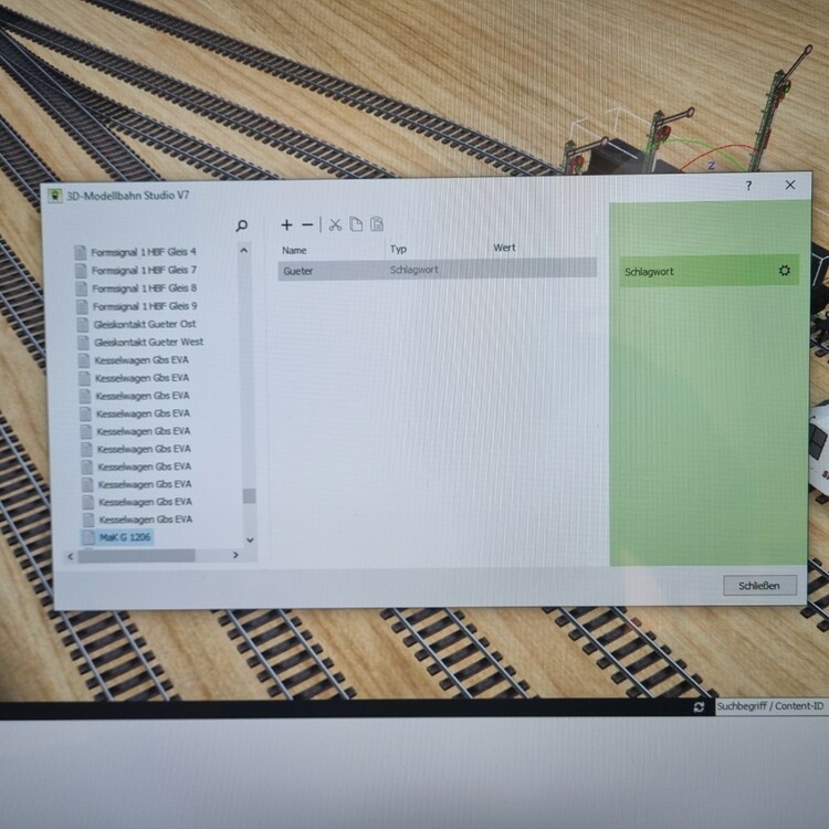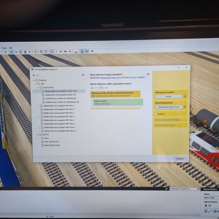 Hallo Götz Ja die Anlage ist relativ groß, aber ich habe hier versucht alle neuen Möglichkeiten der Version V7 einzubinden und zu verstehen. Die Bedingung hatte ich schon mal geändert aber es funktionierte ja nicht ! Die entsprechende Weiche heißt 1742 Gueter West und dem davorliegenden Gleiskontakt. Die dazugehörige EV steht unter HBF im Unterordner Gueter. Sorry wenn ich es Dir so schwer mache . Liebe Grüße Holger