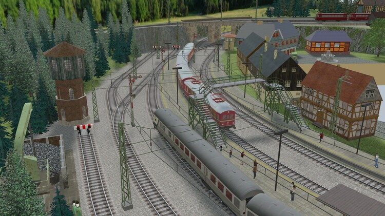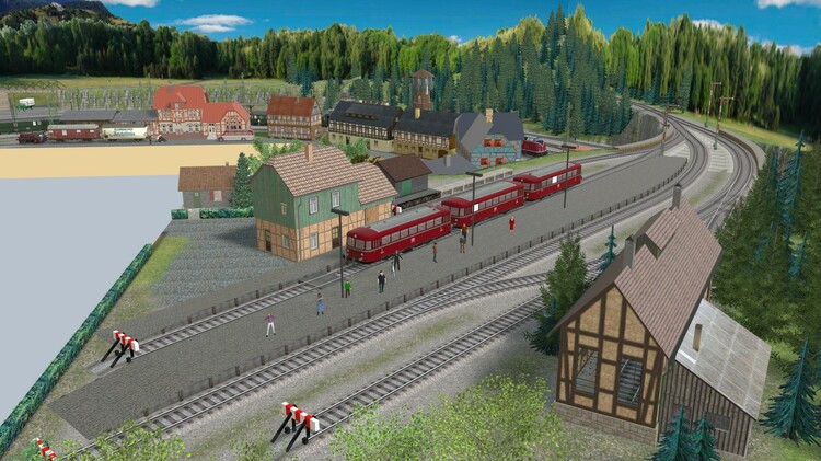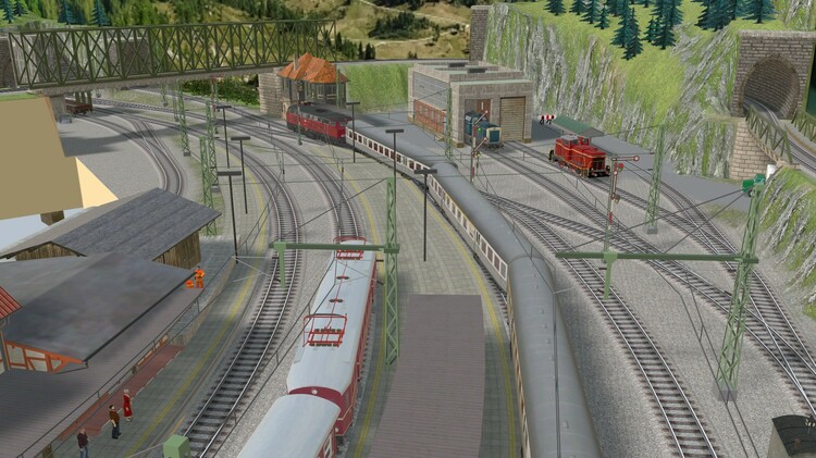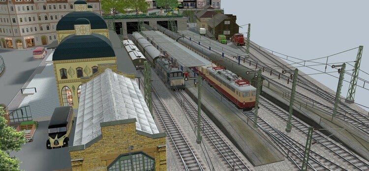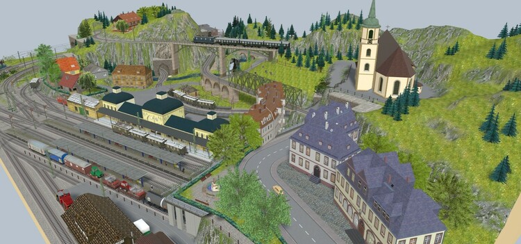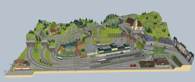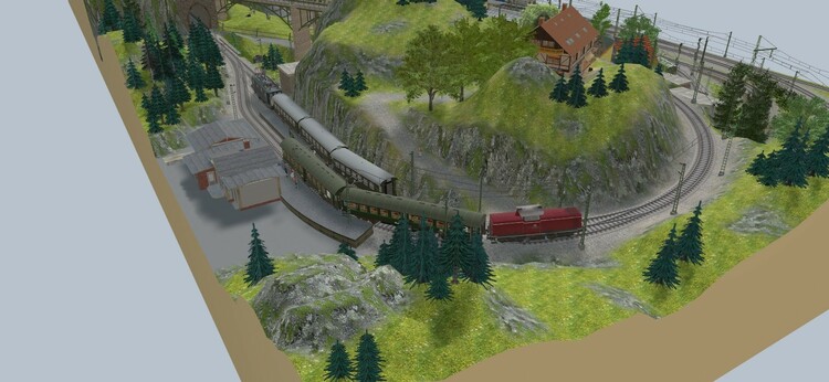 Diese Anlage habe ich nach einem Vorschlag aus dem "Stummi"-Forum. https://www.stummiforum.de/t191493f154-Plansammlung-U-Anlagen-mit-Maerklin-C-Gleis.html (Post #6) als „Übungsanlage“ für V7 gebaut. Sie ist meine erste mit virtuellen Depots, Fahrstraßen und einer freien Anlagenform. Der Klassiker "Eingleisige Nebenbahn zweigt von zweigleisiger elektrifizierter Hauptstrecke ab und endet in einem Kopfbahnhof" wurde hier, wie ich finde, in einer besonders schönen Art und Weise umgesetzt! Durch die geschwungene Form der Gleisanlagen befindet sich der Betrachter immer im Mittelpunkt des Geschehens, außerdem sind bei überschaubaren 2,70m x 2,40m in H0 lange Züge bis 6 Reisezugwagen am Bahnsteig möglich. Außerdem ergibt sich ein schönes Bild, da sich der Betrachter fast immer im Kurveninneren befindet und dadurch die Waggons nicht unschön auseinander gezogen werden. Gefallen haben mir aber auch die vielfältigen Rangiermöglichkeiten und das kleine BW. Danke an den geistigen Vater des Gleisplanes! Ich habe die Strecke gedanklich in ein deutsches Mittelgebirge und in die beliebte Epoche III verlegt. Auf der Hauptstrecke verkehren viele Fern- und Güterzüge ohne Halt in Loitz. Bei den Güterzügen finden sich manchmal auch noch Dampfloks, aber auch nagelneue TEE-Züge mit modernen 103ern befahren die Strecke. Da sich die Strecke in späteren Verlauf noch mal verzweigt sind viele Regionalzüge auch mit Dieseltraktion unterwegs. Auf der Nebenstrecke pendelt ein Nahverkehrszug zwischen Loitz und dem Endbahnhof in Schapen, zusätzlich gibt es noch einen Eilzug, der über Loitz hinaus in die Landeshauptstadt verkehrt. Die Anlage ist mit einer Automatik ausgestattet, nach Betätigung des entsprechenden Knopfes an der Vorderseite startet der Zugverkehr auf der Hauptbahn und auf der Nebenstrecke. Wenn man die Automatik wieder ausschaltet leeren sich die Strecken und man kann nach Herzenslust rangieren. Bisher ist die Anlage als Entwurf veröffentlicht, da das zweigleisige Brückensystem von @Roter Brummer benötigt wird, welches noch nicht veröffentlicht ist! Wer sich das aber selber holt, kann sich die Anlage aber schon mal anschauen. Die ID lautet: 653AB00E-894B-4349-9B4C-BD2E8FB0AFB3 Viel Spaß damit!