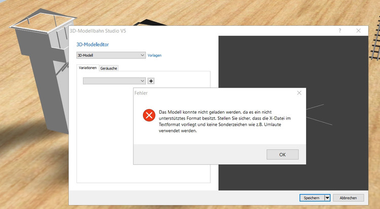 Hallo BahnLand, erster Hoffnungsschimmer am Horizont. Was habe ich gemacht: Übersehene Umlaute ersetzt Mesh-Meldung, Hinweis aufgenommen und Modell bereinigt Modell "eingefärbt" BahnLand DirectX ist komplett durchgelauf und letzter Eintrag u.Z. OK Trotz wiederholtem Durchsehen der - GLIEDERUNG in Sketchup kann ich keinen fehlerhaften Eintrag auf die Fehlermeldung vom MBS-V6 finden. Geduld und Spucke hilft vielleicht weiter. Bis später. Schwellensprung