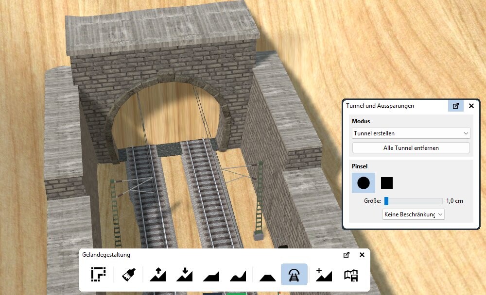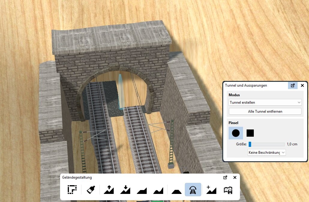 Hallo @alexander42 , schade, den Stream am Samstag habe ich doch glatt verpennt. Aber zum Glück gibt es ja die Aufzeichnung. Es war wieder einmal eine umfangreiche Darstellung mit vielen Anregungen und Tricks (Varianten zu meinem Vorgehen). Nur dann der Tunnel-Ausschnitt ab 3:08. Na gut, nach knapp über 3 Stunden Erklären, da läßt die Konzentration schon nach. Auch Götz, der ja einer der Schöpfer von MBS ist, hat Dich nicht gebremst. Warum dieser riesige Gelände-Ausschnitt? Dann mußtest Du das Loch mit einer weiteren Bodenplatte unterfüttern. Das geht doch wesentlich filigraner. Am Beginn steht, wie bei Dir auch, der Aufbau von Portal, Tunnelröhre und Stützmauern. Dann wird das Gelände "aufgeschüttet". Tunnelportal und Gleise verschwinden unter der Landschaft. Für die nächsten Schritte (Bahndamm / Einschnitt) herstellen muß zunächst das Gleis selektiert werden. Natürlich enden die Gleise nie am Tunnelportal, so daß evtl. zu viel Gelände dem Einschnitt zum Opfer fiele. Daher zunächst: Die Oberfläche ausblenden, Dann die Gleisenden von außerhalb des geplanten Tunnels bis unter das Tunnelportal ziehen. Daß sie mit anderen vorhandenen Gleise überlappen, schadet nicht. Nun kann man das Gelände wieder einblenden und die Gleise, die am Tunnelportal enden (von außen kommend) selektieren. Danach mit dem "Rampen und Böschungen" Tool die optimalen Werte einstellen. Man sieht ja simultan, wie der resultierende Einschnitt aussieht. Ist man mit dem Ergebnis zufrieden, "Übernehmen" drücken nicht vergessen. Jetzt kommt das "Glätten" Werkzeug für einen harmonischen Gelände-Verlauf zum Einsatz. Noch ist der Tunnel mit einer nahezu senkrechten "Wand" verschlossen. Diese gilt es im nächsten Schritt zu durchbrechen. Dazu wird das "Tunnel und Aussparungen" Tool ausgewählt. Ich stelle die Werkzeug-Größe meist auf 1mm ein. Nun kann man sehr filigran die Wand "aufstemmen". Einfach mit gedrückter linker Maustaste die Wand-Raster entlangfahren. Hat man alle Elemente erwischt, kann das Ergebnis so aussehen. So, nun viel Spaß beim Nachvollziehen. Gruß Andreas P.S. Wenn Du die Oberleitung auf der Paradestrecke verlegst, wirst Du ein kleines Problem mit der Kurven-Überhöhung bekommen. Aber zu diesem Thema hatten wir mit einigen Forums-Mitgliedern schon "vor einer Ewigkeit" eine Lösung erarbeitet. Es wird einfach eine leicht versetzte, nicht geneigte Hilfsspline verlegt. Denn der Schleifer soll ja optimal von der Oberleitung überstrichen werden.
