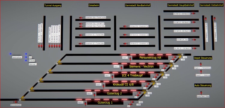 Moin, Moin Hier mein aktuelles Projekt in der Version 1.8-V7 Beschreibung der Anlage "Utopia V1.8-V7" Alle Fahrstraßen außer den 4 Rangierstraßen können über das GBS geschaltet werden. Am einfachsten ist es das GBS auf einen 2.Monitor zu legen. Das GBS ist so angelegt das die Haltepunkte in Richtung der Bahnhöfe liegen. Ich habe mit Absicht und aus Platzmangel kein komplettes Schienenabbild erstellt. Wenn an einem Haltepunkt mehr als eine Fahrstraße zu aktivieren ist sind auch mehrere Startsignale mit Fahrstraßen Routen vorhanden. Der Schattenbahnhof ist mit einem Zähler ausgestattet der das Einfahrtssignal steuert und auf "Fahrt" schaltet sobald wieder ein Platz frei ist. Ein Doppelklick auf ein Signal im GBS startet den Zug falls die Fahrstraße frei ist ( siehe Video von @Goetz " Schattenbahnhof (Teil1)") Die Taster im GBS links neben den Fahrstraßen "Depot 1" schicken den Zug direkt ins Depot. Die benötigten Fahrstraßen werden automatisch geschaltet. Solange ein Zug auf dem Weg ins Depot ist sollte man tunlichst vermeiden einen anderen Zug losfahren zu lassen da man sonst vielleicht eine benötigte Fahrstraße löscht, in dem Fall wird der Zug irgendwo an einem Signal stehen bleiben und man muss ihn manuell ins Depot fahren (oder sonst wohin). Die Taster unter "Depot Steuerung" lassen einen Zug der jeweiligen Gattung "Personenzug" oder "Güterzug" aus dem Depot 2 in den Schattenbahnhof ausfahren. Die Züge fahren grundsätzlich ins Depot 1 und werden aus Depot 2 wieder auf die Anlage geschickt. Das Depot 3 habe ich nur angelegt um ein paar Züge die im Moment nicht gebraucht werden abzustellen. Sollte sich kein Zug der jeweiligen Gattung im Depot befinden wird nur die erste Fahrstraße die zur Abfrage benötigt wird geschaltet. Ist kein Zug der Gattung vorhanden wird sie wieder deaktiviert. Die Steuerung der jeweiligen Gattung zum Ausfahren wird über die neue Möglichkeit der Selektion über ein Schlagwort im Depot realisiert. Der Taster unter "Auto Steuerung" stoppt alle Autos oder startet sie. Die Steuerung der Autos muss noch verbessert werden . Es gibt noch keinerlei Vorfahrtsregelungen, da bin ich noch dran (später). Als nächstes will ich erst mal versuchen die EV zu entschlacken. Vielleicht probiere ich die Möglichkeiten mit den Listen und Tabellen mal aus wenn ich sie denn mal verstanden habe 😉 mal sehen. Anregungen oder auch Kritik ? Ansonsten viel Spaß, bei was auch immer 😎 ID: 454A8391-A889-4738-859D-33A3E1398671