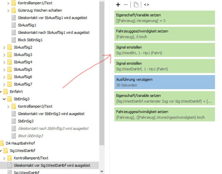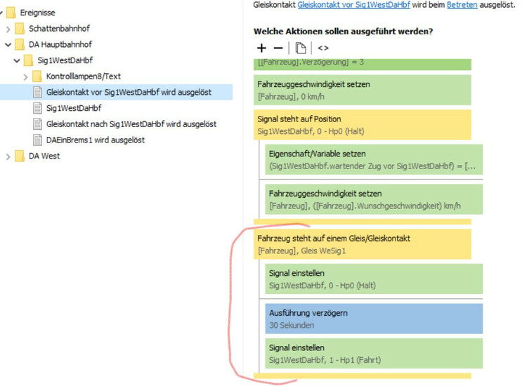 Moin, moin Irgendwie steh ich auf den Schlauch. Mein Zug steht vor dem Signal "Sig1WestDaHbf". Dort soll er 30 Sekunden warten und dann weiterfahren. Das klappt auch einwandfrei wenn ich das "Ausführung verzögern" und das "Signal einstellen" direkt hinter die vorherige Bedingung stelle. Jetzt kommt's aber.....Er soll aber nur dann weiterfahren wenn auf dem Gleis "Gleis WeSig1" am nächsten Bahnhof kein anderes Fahrzeug steht. Mit dem gekennzeichnetem Abschnitt steh ich auf Kriegsfuss, hat da Jemand eine Idee ? Ist wahrscheinlich ganz einfach aber ich komm nicht dahinter.....