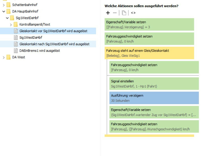 Hi Einen Teilerfolg hab ich schon mal erreicht 😊 Wenn der Zug am Signal "Sig1WestDaHbf" hält und das "Gleis WeSig1" frei ist fängt er an die 30 Sek runter zuzählen und fährt wie gewünscht los. Sollte das "Gleis WeSig1" belegt sein hält er an seinem Signal an. Soweit so gut. Wenn das "Gleis WeSig1" besetzt ist und er warten muß bis es dann wieder frei wird denkt er nicht daran loszufahren. Offenbar fragt er die Bedingung nur einmal ab ? Auch wenn ich das Signal von Hand auf Fahrt stelle muß ich die Geschwindigkeit noch manuell einstellen damit er los fährt.
