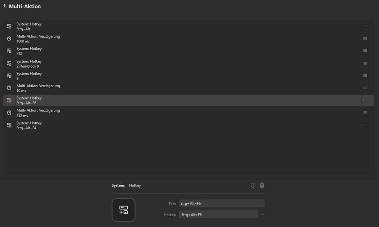 Hallo @Neo! Das Stream Deck ist völlig frei programmierbar. Sowohl die Oberfläche als auch die Funktion der einzelnen Tasten. Ähnlich unserer Ereignisverwaltung. Das folgende Beispiel ist willkürlich gewählt. Die Aktionen im Screenshot auch. Tastenkombination Strg & Alt wird gedrückt Optional weitere Ausführung verzögern Taste "X" wird gedrückt usw. Das ganze lässt sich in einer "Multi-Aktion" (ähnlich einem Makro - ist es wohl auch) abspeichern und beliebig tief stapeln. Ein Tastendruck löst dann die hinterlegten Routinen aus und arbeitet sie ab. Eine Unterscheidung zwischen "Taste wird gedrückt" und "Taste wird losgelassen" findet nicht statt (*). Zwischen linken und rechtem Modifier kann unterschieden werden. VG, Cafépause (*) Evtl. könnte aber hier auch das Studio "Key down / Key up" entsprechend auswerten.