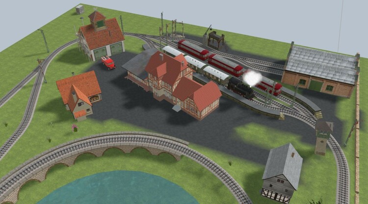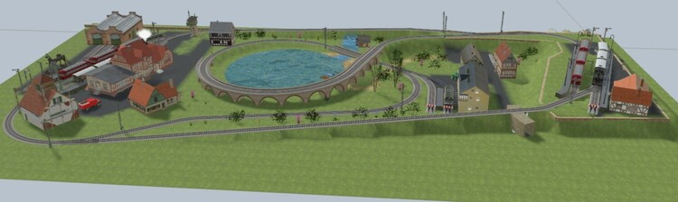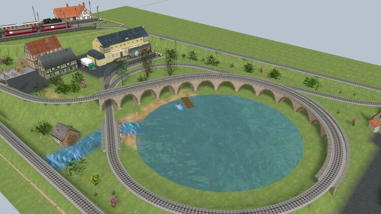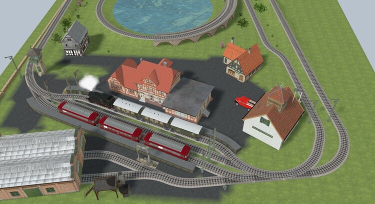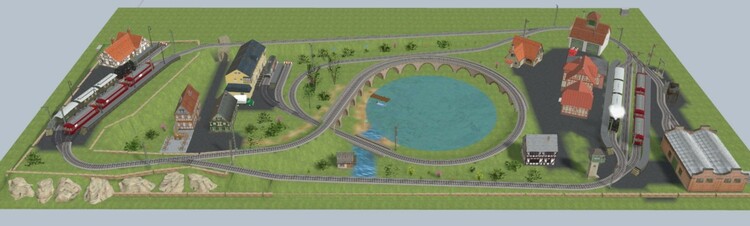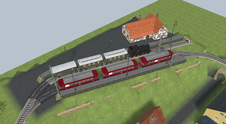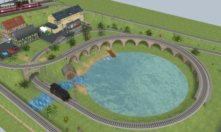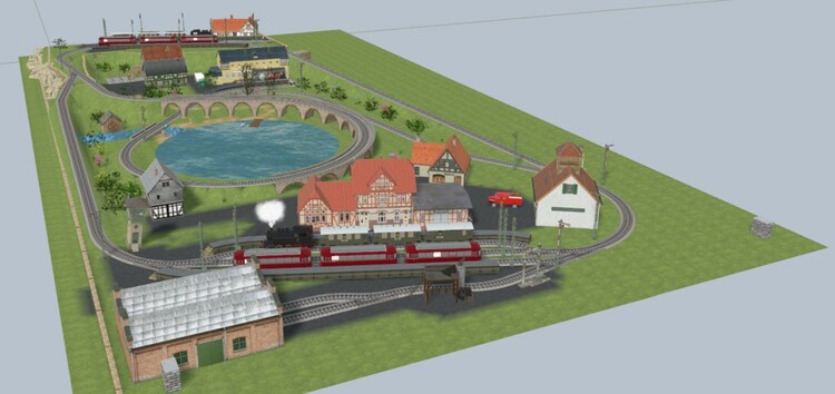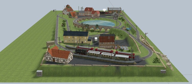 Ich habe nun eine aktualisierte Version hochgeladen. Ihr findet sie unter der Content-ID: FE992D7C-E969-42E7-AC3B-A055B5891509. Wesentliche Änderungen: Linken Bahnhof auf 25 cm über Anlagen-0 erhöht (vorher: 20cm) Viadukt nach links verschwenkt; die Züge unterqueren die Strecke nun weiter unten. Die Durchfahrtshöhe von 20 cm passt für meine Loks meines Erachtens nach. Diese sind 15cm hoch. Bahnhofsgleise links verlängert. Die BR 80 und die drei Lokalbahn-Waggons passen nun gut auf die Gleise. Die 3D-Modelle sind zudem alle jeweils 4cm länger als meine Piko-Modelle. Bahnhofsausfahrten links unten und rechts oben anders gestaltet, um die Länge der Rampen zu erhöhen. Bedingt durch die größere Höhe des linken Bahnhofs ist jetzt die vordere Rampe die steilste. Viadukt: 25 cm Höhenunterschied auf 765 cm = 3,27 Prozent Vordere Rampe: 25 cm Höhenunterschied auf 570 cm = 4,39 Prozent Hintere Rampe: 25 cm Höhenunterschied auf 690 cm = 3,62 Prozent Zufahrt zum Lokschuppen wie vorgeschlagen geändert. Habt ihr hier weitere Vorschläge? Danke!