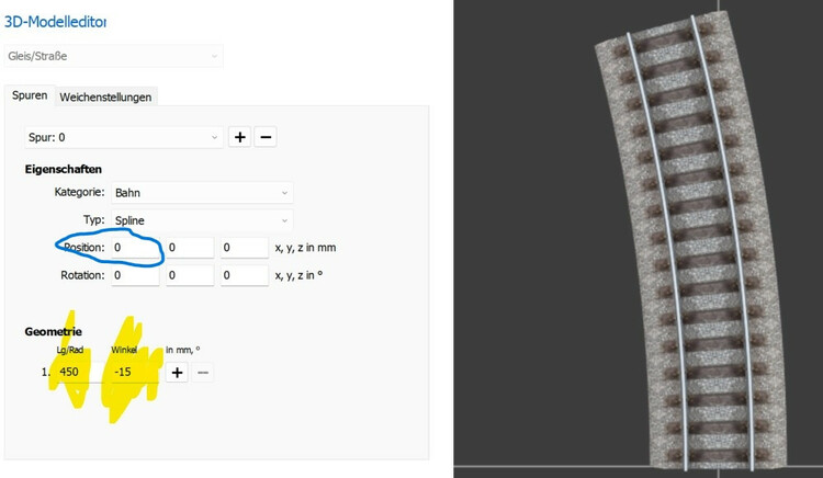 Hi ich kann mir mal selber antworten. Im Prinzip ist es sehr einfach. Ich bin absoluter Anfänger meine Lösung ist sicherlich nicht perfekt und auf meinem Wissenstand kreiert. Hier ein Foto welches ich in den letzten paar Minuten hinbekommen habe: Letzendlich brauche es immer zwei Gleise: Das gerade Gleis und das gebogene Gleis. Nehmen wir eine Abzweigung einer Weiche wo das Dreischienengleis gerade ist und ein normales gebogenes Gleis dazu kommt. Beide auf eine Länge bringen und dann das abzweigende Gleis unter Eigenschaften unten links und Bearbeiten dann einen Winkel von 15 Grad eintragen. Das abbiegende Gleis habe ich dann auf 450mm verlängert. Gradzahl für die Abbiegung entweder positiv oder negativ eintragen. Nun beide mittels x und y Koordinaten genau übereinanderschieben und gruppieren. Da es sich hier um keine Weiche handelt ist sonst nicht sweiter zu tun. Baue ich H0e Gleise mit ein (auf dem Screenshoot nicht zu sehen!) ist im blauen Feld noch der Versatz einzutragen, für H0e ist dies -3,94! Wie man auf Bild 1 sieht ist oben auch eine Abzweigung H0 Hauptgleis und H0e Nebengleis abzweigend möglich. Dazu braucht es die grüne H0e Gleislehre im Katalog unter Verkehrswege - Gleis - zusätzlich. Meine Frage jetzt nur noch, wie kann ich diese Gleise nun meinem Katalog zufügen? Soweit von mir, eine Kreuzung dürfte auf dies Art und Weise auch sehr einfach zu gestalten sein. Gruß Euer Elluminatus