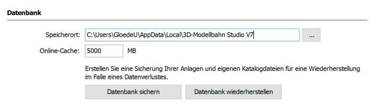 Der Standardplatz für die Datenbank ist ja "C:\Users\xxx\AppData\Local\3D-Modellbahn Studio V7". Diesen hatte ich geändert auf eien USB-Stick und dort sind auch Dateien im dem Ordner drin.