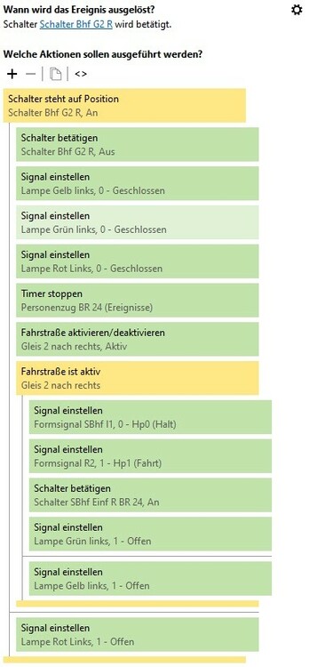 4. Hallo zusammen, ich bin Anfänger und versuche die Logik in diesem sehr komplexen System zu verstehen. Ich habe eine kleine Anlage gebaut, zunächst versucht alle Signale und Weichen selbst zu setzen. Nun habe ich verstanden, dass ich nur die Fahrstraßen aktivieren/deaktivieren muss. Die Züge fahren nun auch in einer Abfolge, wie ich mir das vorgestellt habe. Doch hier nun ein Problem: Das Signal Formsignal R2 wird nicht auf Hp1 (Fahrt) gesetzt. Um den Ablauf nachzuvollziehen, habe ich die Kontroll-Lampen Lampe Gelb Links, Lampe Grün links und Lampe Rot Links eingebaut. [10:57:55] Schalter wird betätigt -> Schalter Bhf G2 R, 1 [10:57:55] 3 BR 24 Aus Bhf G2 R [10:57:55] Schalter wird betätigt -> Schalter Bhf G2 R, 0 [10:57:55] 3 BR 24 Aus Bhf G2 R [10:57:55] Schalter wird betätigt -> Schalter SBhf Einf R BR 24, 1 [10:57:55] 4 BR 24 Ein SBhf Ef R [10:57:55] Schalter wird betätigt -> Schalter SBhf Einf R BR 24, 0 [10:57:55] 4 BR 24 Ein SBhf Ef R [10:57:55] Signal schaltet -> Lampe Rot Links, 0 [10:57:55] Signal schaltet -> Lampe Grün links, 1 [10:57:55] Signal schaltet -> Formsignal R2, 0 Das Protokoll und die Aktionen im Ereignis sind unterschiedlich und das Formsignal wird nicht auf Fahrt gesetzt. Wer weiß warum nicht?
