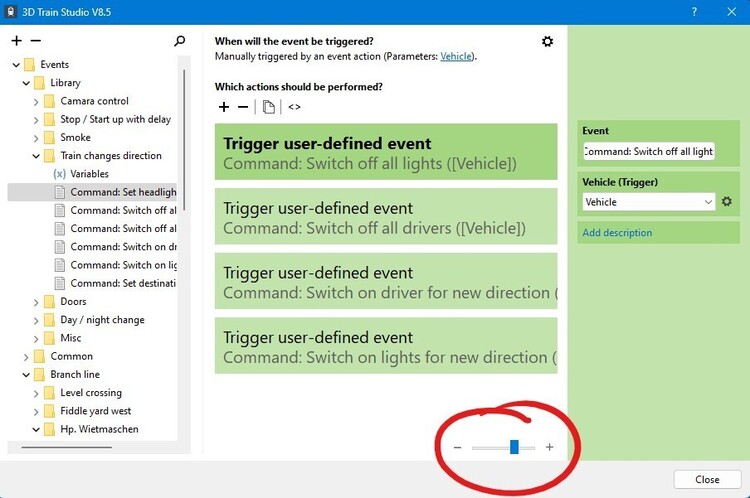 1. Falls Du Dich jetzt fragst, wozu "Alle Fahrzeuge" überhaupt gut sein soll, dass hier ein Beispiel, das auf einer meiner Anlagen so im Einsatz ist: Hier geht es um drei verschiedene Kontakte und mir ist es egal, welche Fahrzeuge gerade auf den Kontakten stehen (oder auch nicht stehen). Es soll folgendes passieren: Betritt (irgendein) Fahrzeug Kontakt ➀ und steht kein (NOT Any) Fahrzeug auf Kontakt ➁ dann soll das Fahrzeug, welches auf Kontakt ➂ steht, mit einer bestimmten Geschwindigkeit (die hier in einer Variablen hinterlegt ist) losfahren. Das "All" in der Anweisung zu ➂ ist logisch auch ein "Any", denn auf einem Kontakt kann nur ein Fahrzeug stehen. Steht auf Kontakt ➂ kein Fahrzeug, passiert einfach nichts.