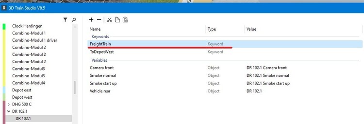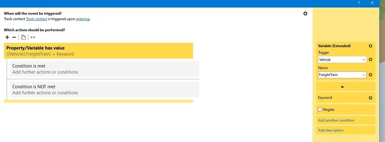 Hallo @ronny_the boos_ schindler, die Methode der Wahl ist es, das angetriebene Fahrzeug mit einer Objektvariablen vom Typ Schlagwort und dem Inhalt "Güterzug" (oder wie im Beispiel "FreightTrain") zu versehen und im Gleiskontakt eben diese Bedingung abzufragen, also so: Beste Grüße Phrontistes- Weichen in Fahrstrassen werden freigegeben, wenn der Zug sie noch nicht ganz verlassen hat