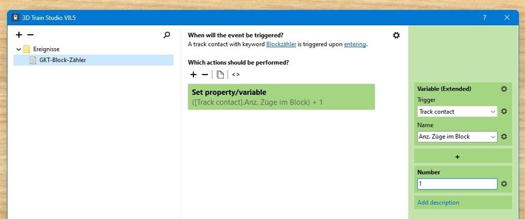 Hallo Jürgen @jloos, Ja, Du bekommst beim Betreten eines (Signal-)Kontaktes immer das angetriebene Fahrzeug als Auslöser (wobei es tunlichst immer nur ein angetriebene Fahrzeug im Verbund geben sollte). Nicht "obwohl", sondern "weil" der Auslöser für das Ereignis "Betreten" das angetriebene Fahrzeug ist (und nicht der geschobene Wagen). Das würde ich etwas anders formulieren: Bei der Bedingung "Fahrzeug steht auf Gleis/Gleiskontakt" prüfst Du auf das Fahrzeug, welches tatsächlich auf dem Gleiskontakt steht. Das ist nicht zwingend das angetriebene Fahrzeug sondern ggf. der geschobenen Wagen. Deshalb prüfe ich, wie oben beschrieben, auf immer auf vehicle oder vehicle.vehicle rear, dann ist es egal wie rum der Zug fährt. Das setzt voraus, dass man händisch in jedem Fahrzeug eine Variable vom Typ Objekt anlegt und in diese händisch das Fahrzeugobjekt des Fahrzeugen am anderen Ende (Triebkopf, Steuerwagen oder was auch immer) einträgt. Je nachdem reicht es aber auch, zu prüfen, ob irgendein Fahrzeug auf dem Kontakt steht ([Any] in der deutschen Version [Beliebig] wenn ich mich recht erinnere). Das verstehe ich nicht ganz. Du kannst die Zählvariable im Kontakt "unterbringen" (Objektvariable vom Typ numerisch) und Du weißt auch, welcher Kontakt gerade betätigt wurde, denn dieser steht Dir im Ereignis als Auslöser zur Verfügung. Das ist nur eine Zeile in der EV. Diese Lösung funktioniert auch mit dem Schlagwort, weil jeder Kontakt seine eigene Variable "Anz. Züge im Block" hat. Eine andere Frage ist es dann, wer unter welchen Umständen die Zählvariable im "richtigen" Kontakt wieder vermindert. Beste Grüße Phrontistes