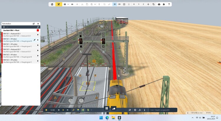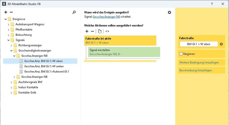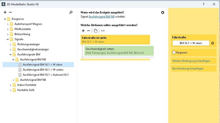 Hallo @Goetz, Die Konfiguration des Signals ist bei Hp0 auf Abbremsen auf 0 eingestellt und bei KS1 ist alles aus. Dies habe ich so eingestellt weil ich von einem Signal mehrere Fahrstraßen schalte mit unterschiedlichen Geschwindigkeiten, die dann per EV geregelt werden. Das Signal soll aber schon früher auf Halt umspringen und nicht erst in der Mitte des Zuges, deswegen habe ich dies so eingestellt. Hier auch wieder je nach Geschwindigkeit zwischen 7 und 11 Sekunden. Das die Signale bei Aktivierung der Fahrstraße auf KS1 gehen weiß ich. Dann muss ich das mal ohne den Eintrag in der EV testen. Da hast du Recht das kann ich mir dann sparen. Gruß Thomas- Signal auf Hp0 nach Aktivierung der Fahrstraße