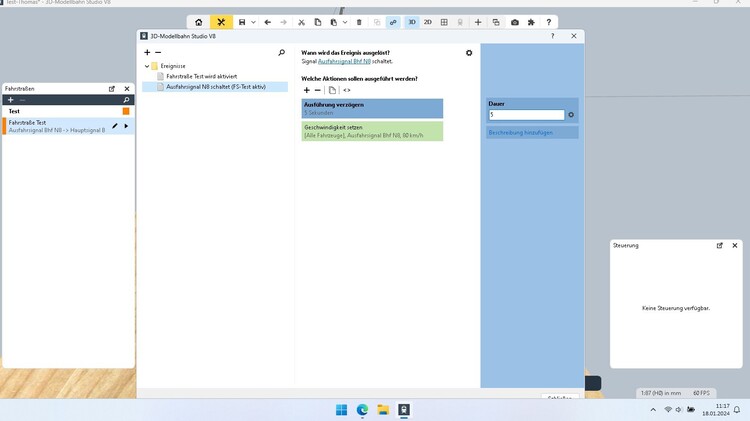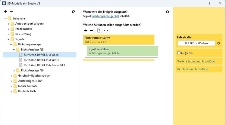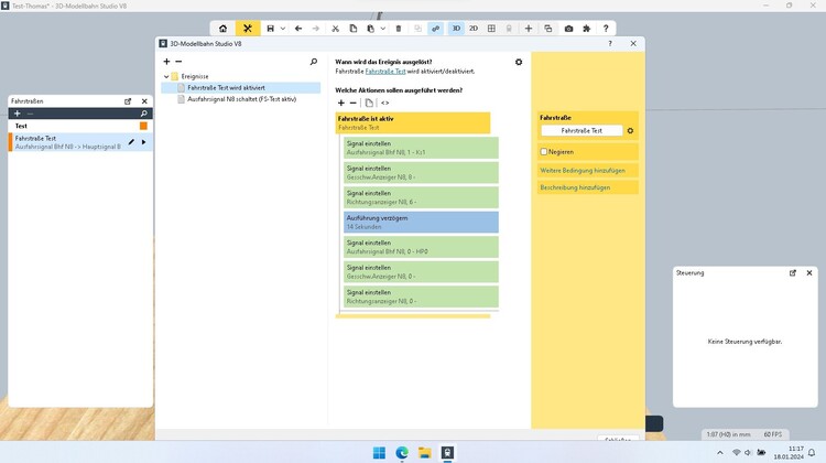 Hallo in die Runde, Ich möchte eine Fahrstraße aktivieren (Bild 01) und nach 3 bzw. 4 Sekunden das Signal wieder auf Hp0 und die Geschwindigkeits- und Richtungsanzeige wieder auf Aus ohne die Fahrstraße zu deaktivieren. Die Signale schalten nach Aktivierung der Fahrstraße wie in den Bildern 02 bis 04 auf die jeweilige Einstellung. Die Signale stellen sich aber erst wieder um wenn die Fahrstraße aufgelöst ist. Wie bekomme ich es hin das die Signale nach den paar Sekunden umstellen? Gruß Thomas- Modellvorstellung