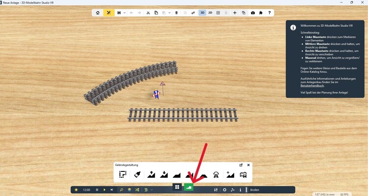21. Hallo @UlliW, zum bearbeiten der Bodenplatte (Größe ändern, bemalen usw.) machst du einen Doppelklick auf die Platte und dann die Auswahl "Geländegestaltung" (Pfeil) Und bei Fragen kannst Du hier im Forum immer Hilfe von den vielen vielen netten Leuten erhalten. Hier sind viele Spezialisten wenn es um die Ereignisverwaltung, Modellbau usw. geht. Gruß Thomas