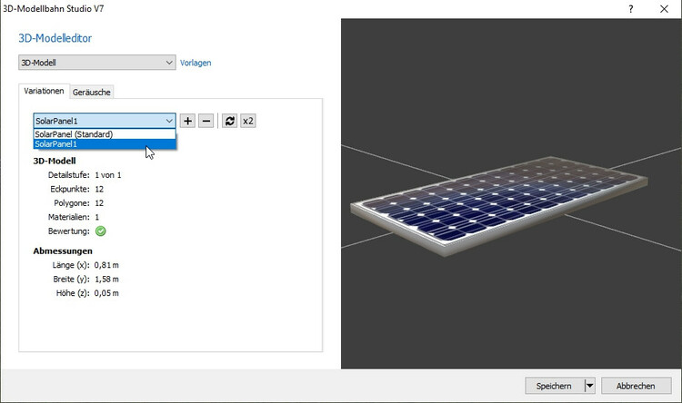 Hallo @siggi, wie schon unzählige Male hier im Forum beschrieben, hat Dein Standard-Modell die Detailstufe "LOD0". Das Modell muss aber NICHT diese Bezeichnung erhalten. Dein Standard-Modell könnte also "SolarPanel.glb" heißen. Die zugehörige Detailstufe heißt dann "SolarPanel_LOD2.glb". Bei solch einem "kleinen" Modell benötigst Du keine "_LOD1"-Detailstufe. Eine Variation Deines Modells könnte dann "SolarPanel 1.glb" heißen und die evtl. Detailstufe "SolarPanel 1_LOD2.glb". Über den 3D-Modelleditor werden dann die Modelle und die Variationen in das MBS eingefügt. Die Detailstufen der einzelnen Modelle müssen sich dabei im gleichen Verzeichnis befinden und werden durch den Modelleditor automatisch mit eingebunden. Weitere Informationen zu den Detailstufen und das Einbinden der Modelle darfst Du gerne im Wiki nachlesen. Schöne Grüße SputniKK