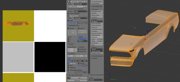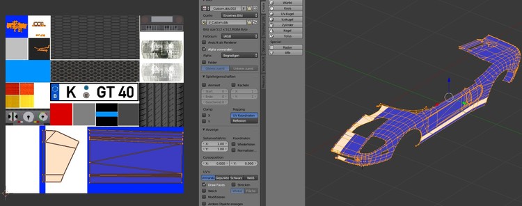 Hallo Hans, fürs Modellieren benutze ich den Blender und für die Texturen Paint.Net. Eine Textur in Paint.Net sieht bei mir z.B. so aus: Im nächsten Bild siehst Du, wie die Zuordnung der Textur in Blender geregelt ist: Das Chassis besteht beim BMW nur aus einer Hälfte, die im Blender durch den Modifier "Spiegeln" zum vollständigen Chassis ergänzt wird. Natürlich wäre es möglich z.B. die Motorhaube oder die Türen zu separieren. Aber woher soll ich wissen, was der geneigte Tauschtextur-Benutzer denn alles einzeln anmalen möchte? So eine Tauschtextur bleibt immer ein Kompromiss zwischen der Faulheit des Modellbauers und dem Wunsch des Benutzers. Beim Ford GT40 sieht die Textur z.B. so aus: Hier hatte ich von Anfang an den Rallye-Strefen mit eingeplant. Schöne Grüße SputniKK