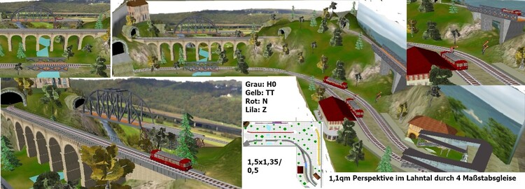 Hallo, Modelleisenbahner Gerade bei kleinen Modellbahnanlagen kann es hilfreich sein, wenn man mit der Perspektive "Weite" auf der Anlage generiert. Ich habe dafür den Trick mit 4 Baugrößen genutzt. H0, TT, N und Z auf knapp über einem Quadratmeter vermitteln mehr Gelände, wie eigentlich da ist. Gerade der allbekannte Schienenbus ist in jeder Baugröße im Angebot, so das jeder dieses Thema leicht umsetzen kann. Es ist verblüffend, wenn ein Zug vorne "groß" losfährt und über mehrere Strecken "kleiner werdend im Hintergrund verschwindet. Diese Idee wurde vor einigen Jahren in Eisenbahnromantik gezeigt, aber keiner ist so richtig darauf angesprungen. Im Internet habe ich jedenfalls nichts derartiges gefunden. Gruß Modellbahnspass