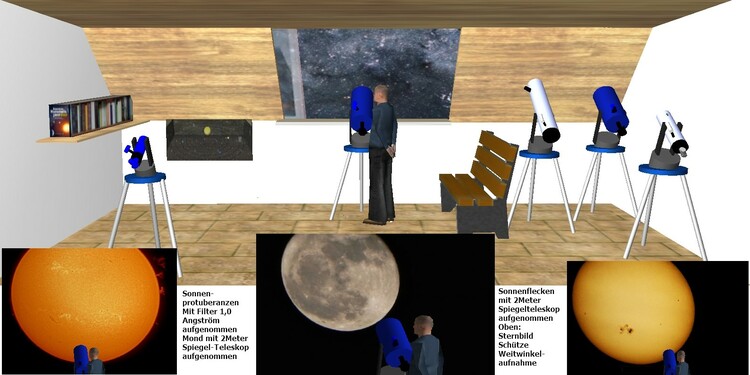 Hallo zusammen Astronomie und Raumfahrt sind zwei Interessengebiete von mir. Daher habe ich diese Hobbys mit Neo`s Programm verbunden und Teile von meiner Homepage in dem folgenden Diorama verarbeitet. Im März 2021 (also 4 - 8 Beiträge vorher) hatte ich bereits mittels der vorhandenen Möglichkeiten ein Original-Standmodell unseres Sonnensystems von mir animiert. Ihr findet es an der linken Seite in meiner Sternwarte wieder. Gewitzte Modellbauer hätten die Möglichkeit, die Teleskope zu animieren und damit eine virtuelle Sternenschau zu installieren. Eine Kamera im Teleskop platziert könnte ein Teil eines "schönen" Filmchens werden. (Diese Möglichkeit habe ich bei meinem Softwarestand aber nicht. Gruß Modellbahnspass