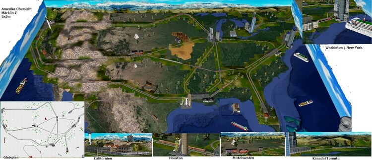 Hallo zusammen Ich hatte es gestern ja schon erwähnt: Diesmal gibt es eine Modellbahn der anderen Art. Bernhard Stein hatte für die deutsche Leistungsschau 1984 in Tokio eine Übersichtsanlage in Spur Z erstellt, die das IC-Streckennetz in Deutschland darstellte. An dieser Anlage habe ich mich orientiert und "A" für Amerika-Übersicht gestaltet. Die Original-Anlage stand vor Jahren ziemlich heruntergekommen im Technikmuseum Sinsheim. Verschiedene Lokalitäten habe ich symbolisch mit nicht Maßstabgetreuen Modellen dargestellt um die Orientierung zu erleichtern. In unserer Altersklasse ist Spur Z ziemlich klein, also zum Vergrößern anklicken Gruß Modellbahnspass