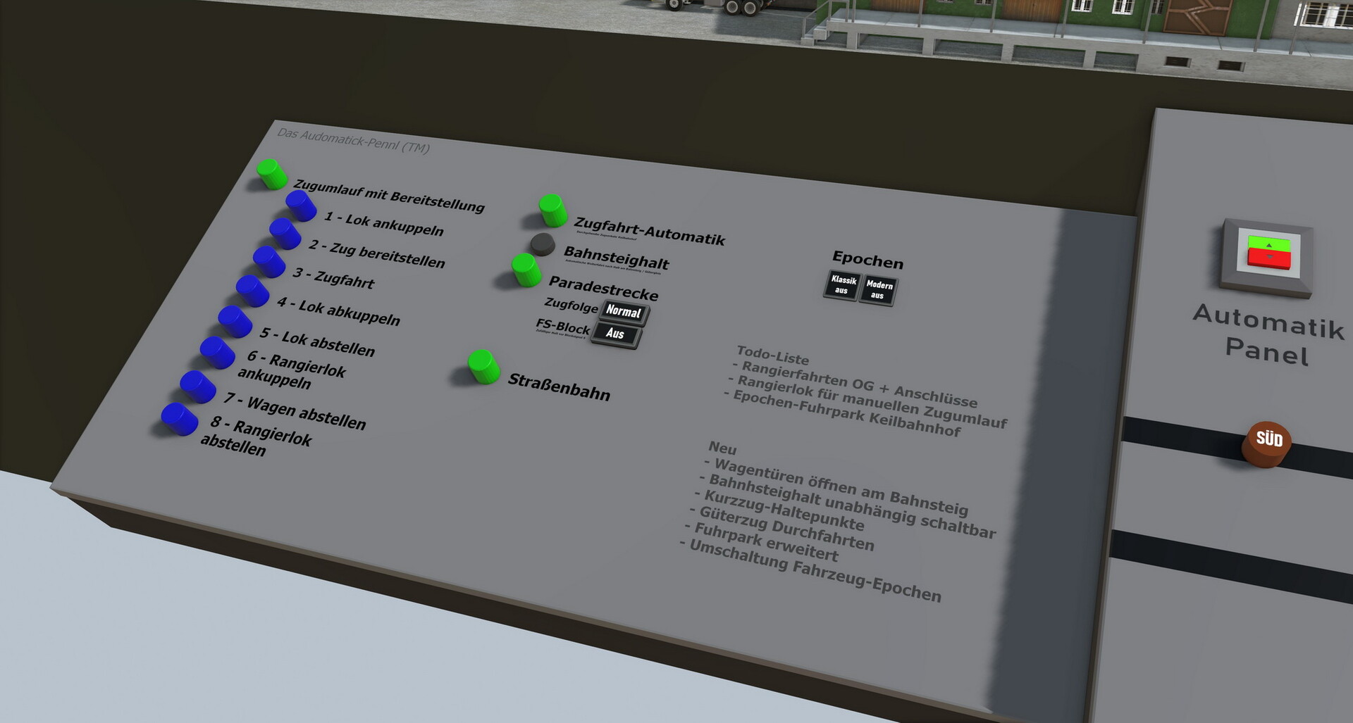 Hallo zusammen! Ich habe noch etwas an den Automatik-Funktionen gefeilt und die aktuelle Version hochgeladen. Schaut es euch gern mal an und teilt mir mit, wenn ihr auf Fehler in der Ablaufsteuerung stoßen solltet. Ich bin für jedes Feedback dankbar! Am besten einfach mit dem Automatik-Knopf die Selbstzerstörung aktivieren und entspannt zurücklehnen... LG Alex- Anlage Keilbahnhof