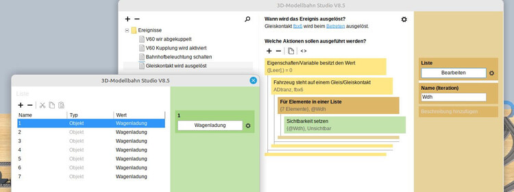 Hallo und erstmal danke an alle!! Tatsächlich ist das mein erster ernstzunehmende Versuch mit der EV und daher etwas holprig. Ich musste meinen Windows PC reaktivieren um mir Eure Vorschläge in der Version 9 anschauen zu können. Wine kann offensichtlich nur bis V 8.5. Das teste ich irgendwann. Ich habe mir alles Vorschläge angeschaut mich für die schlanke Lösung von Brummi entschieden und das funktioniert auch. Aber ... keine Licht ohne Schatten. Meine angepasste Ladung zickt. Die Ladung ist sauber eingepasst und wird auch problemlos ein- und ausgeblendet. Wenn ich jedoch MBS neu starte, stellt sich die Ladung in ungekürzter Form da (siehe Bild) und wenn ich im Muster von Roter Brummer einen (blauen) Wagen dupliziere passiert genau das gleiche. Vermutlich fehlt auch hier nur wieder eine Kleinigkeit. Römi