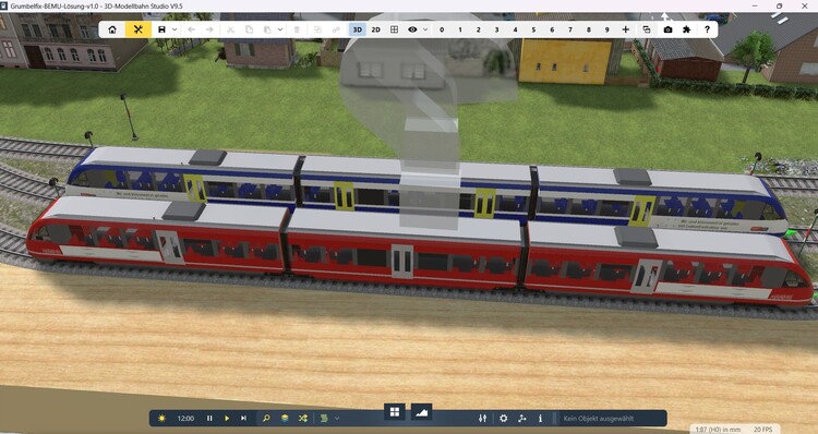 Hallo und guten Abend @streit_ross, also ich fange mal hinten das Antworten an: Ich meine, ich hätte das Update der Demo-Version geladen... werde das aber nochmal prüfen... Und auch Deine P.S. Frage... ...will ich gerne beantworten: Es gibt einen unmittelbaren Bezug zu meinem Beitrag "Ladeprinzip BEMU (Alternative: Dieseltriebwagen mit Einholmstromabnehmer)". Unser Unternehmen hat eine Lösung entwickelt, wie nichtelektrifizierte Bahnstrecken im In- und Ausland, auf denen heute noch Dieseltriebwagen fahren (die aber in Zukunft mit Batteriezügen betrieben werden sollen), mit Energie zum Laden des Triebfahrzeug-Akkus versorgt werden können. Also das Thema BEMU. Für diese Anwendung ist es mein Ziel, eine "virtuelle Anlage" aufzubauen, die in erster Linie das "Prinzip" verdeutlicht und darstellt (daher auch ein "gewöhnlicher" Dieseltriebwagen mit Pantograph verwendet - einen BEMU von Alstom, Stadler & Co. hatte ich nicht im bezahlbaren Rahmen gefunden). Diese Anlage will ich auf einer internen Veranstaltung - Ende Juni - vorstellen/präsentieren. Sie wird die Vorlage/das Briefing für eine echte Modellanlage werden, die danach messetauglich aufgebaut wird und entsprechend transportabel ist. Deine Erklärungen zur Demo werde ich mir anschauen, wenn ich wieder etwas frischer im Kopf bin. Jetzt muss ich erstmal ein wenig am Kopfkissen horchen . Gute Nacht, viele Grüße und einen guten Wochenstart Grumbelfix