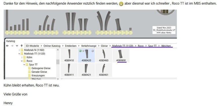 Hallo, habe mir das Modellbahnstudio V8 zugelegt und habe nun festgestellt, dass unter Onlinekatalog - Verkehrswege - Gleise - Maßstab TT (1:120) keine Roco Gleise zur Verfügung stehen. Sehe da nur Tillig und Kühn. Ich vermisse die DKW von Kühn, bzw. Roco. Habe in einem Forum gelesen, von 2023 glaube ich, Modellbahn Studio V7, dass die Roco Gleise dort zu finden sind. Anbei noch ein Bild mit dem entsprechenden Eintrag. Liebe Grüße, Bernhard