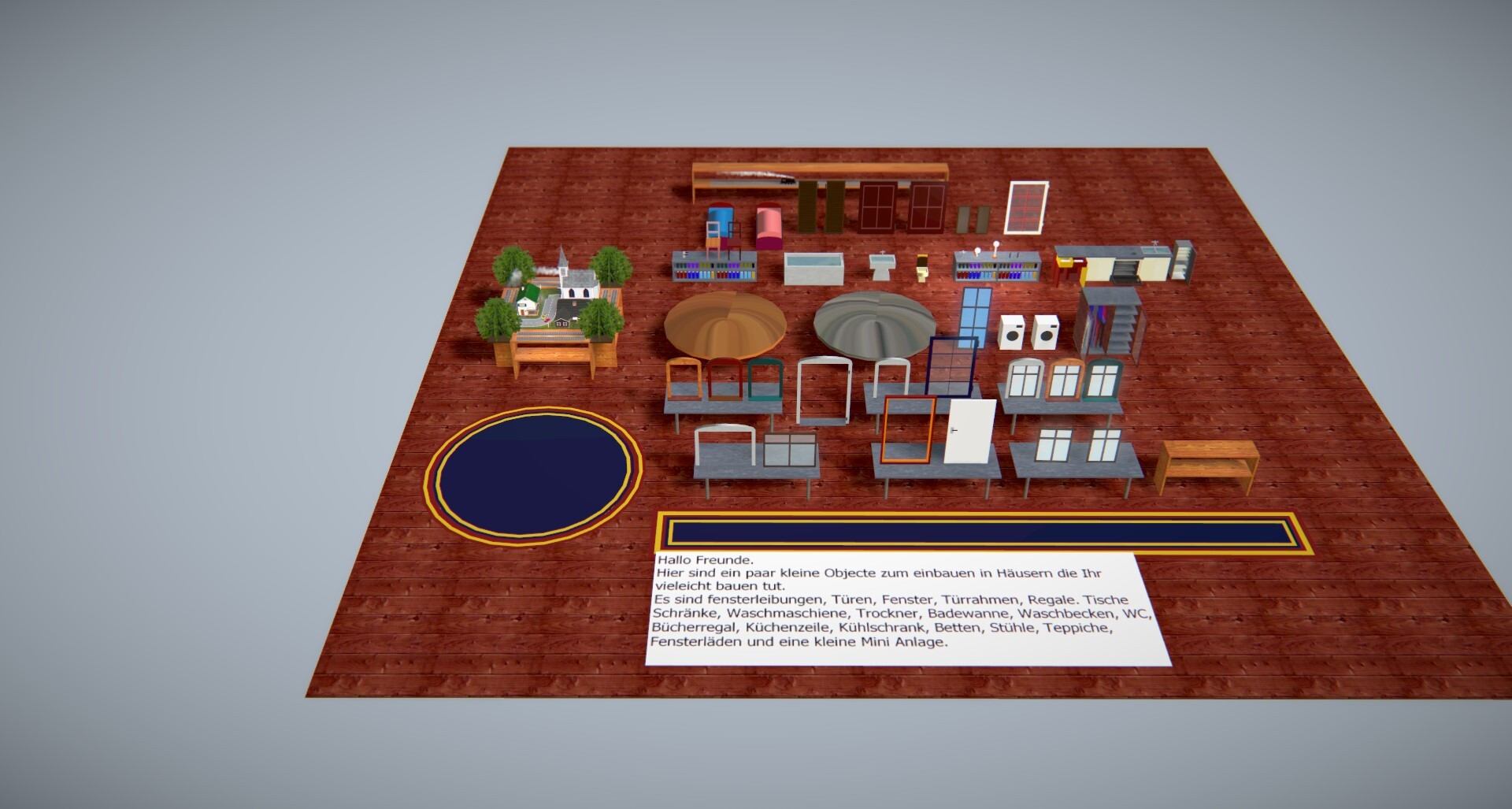 Hallo Freunde. Hier sind ein paar kleine Objecte zum einbauen in Häusern die Ihr vieleicht bauen tut. Es sind fensterleibungen, Türen, Fenster, Türrahmen, Regale. Tische Schränke, Waschmaschiene, Trockner, Badewanne, Waschbecken, WC, Bücherregal, Küchenzeile, Kühlschrank, Betten, Stühle, Teppiche, Fensterläden und eine kleine Mini Anlage. Die Küchenzeile der Kühlschrank und Kleiderschrank sind Animiert. Betätigt dazu einfach die Schalter um dieses zu Sehen. Ihr findet diese unter folgender ID.41BAA4CE-6069-42CB-94D5-31939873011F Wenn Euch diese Gefallen, würde ich mich über eine Beurteilung recht Herzlich freuen Mit Lieben Grüßen Talima