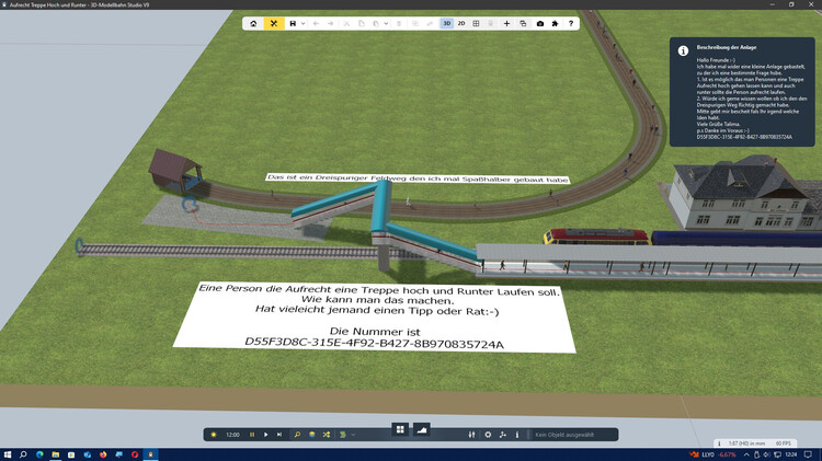 Hallo Goetz:-) Vielen Dank für die Info Ich habe mir schon sowas ehnliches gedacht, das der Aufwand recht hoch ist. Ich glaube man kann durchaus auch mit dieser art des treppen auf und Runter gehen zufrieden sein. Was ich halt noch versucht habe ist den Fussgänger weg mit Drei Spuren zu belegen. Ich hoffe das ich das auch richtig gemacht habe, Habe noch eine Frage zu einer anderen Anlage von mir, und zwar die Anlage mit der Drehscheibe. Sie befindet sich im Ordber Neu. Würdes du vieleicht doch mal einen Blick drauf werfen und mir vieleicht sagen wie ich da noch was verbessern könnte. Ich wehre dir dafür Sehr Dankbar. Mit freundlichen Grüßen Talima.- Aufrecht Treppen hoch und runter Laufen ist das Möglich: