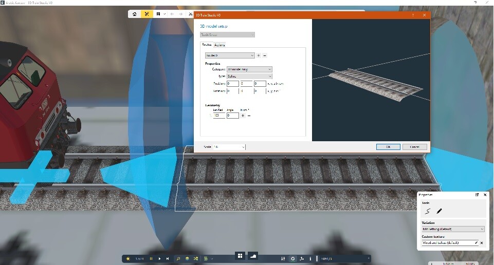Man kann nach dem Portal ein reines 3D-Gleis einfügen, da der Zug in der Luft sonst komisch aussieht. Es passt aber nicht, deshalb muss man zuerst ein normales Gleis einfügen und es dann auf 3D umstellen. Deshalb hatte ich ja schon mal darum gebeten, dass das Portal nicht nur am Ende der Strecke funktioniert.